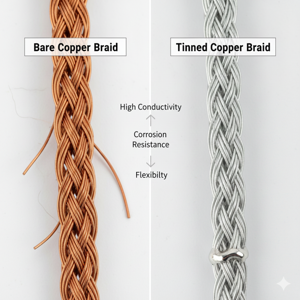 Hai loại dây đồng bện phổ biến nhất là đồng trần (Bare Copper) và đồng mạ thiếc (Tinned Copper), mỗi loại có ưu và nhược điểm riêng: